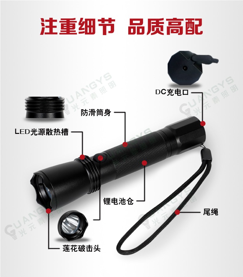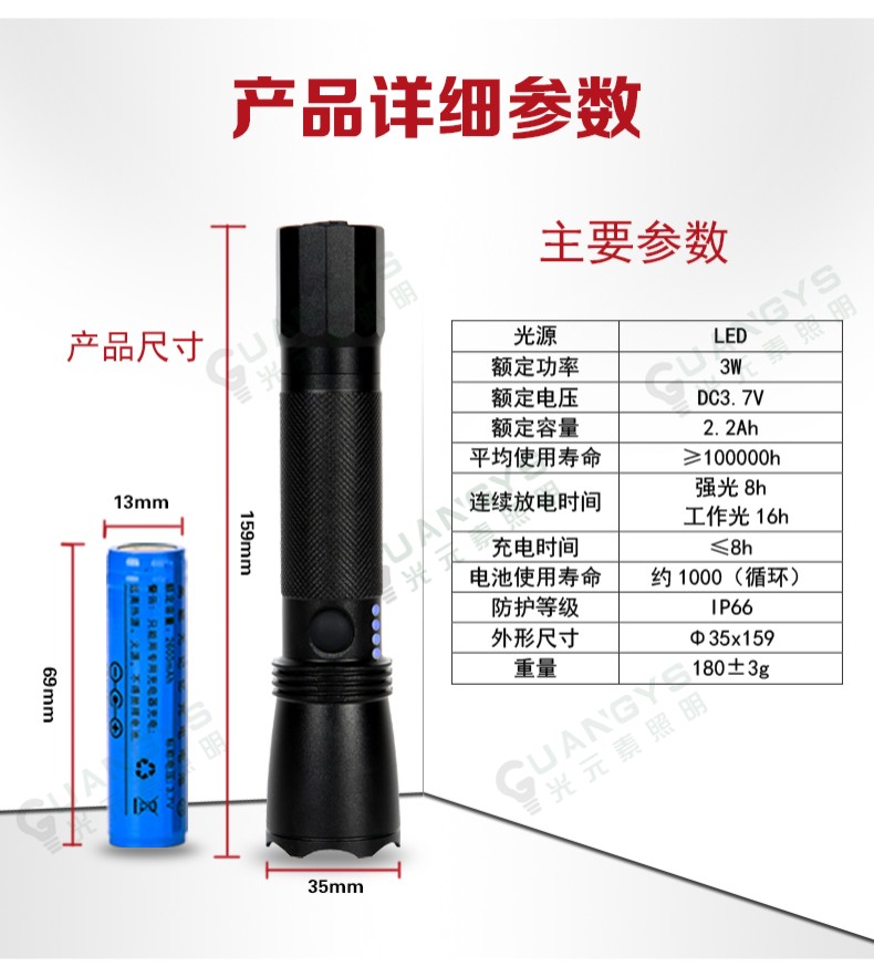 品牌名称:光元素照明 额定电压:3.7V 配用光源:LED 额定功率:3W 防护等级:IP66 产品描述:广泛用于铁路、航运、部队、警察和工矿企业及各种野外工作场所作移动照明和信号指示。(1区、2区)