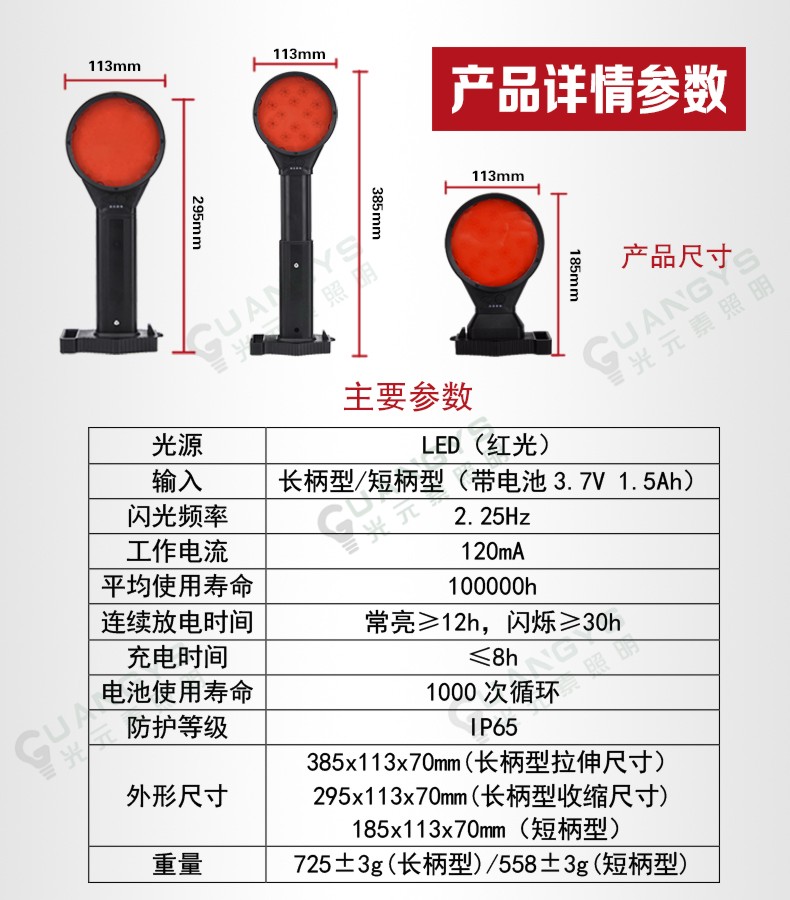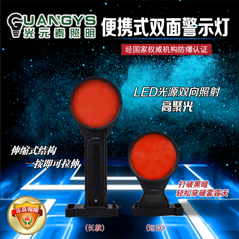 品牌名称:光元素照明 额定电压:3.7V 配用光源:LED 额定功率:1W 防护等级:IP65 产品描述:适用于各种施工、抢险、救护工作人员作警示标志、定位指示以及信号联络用。