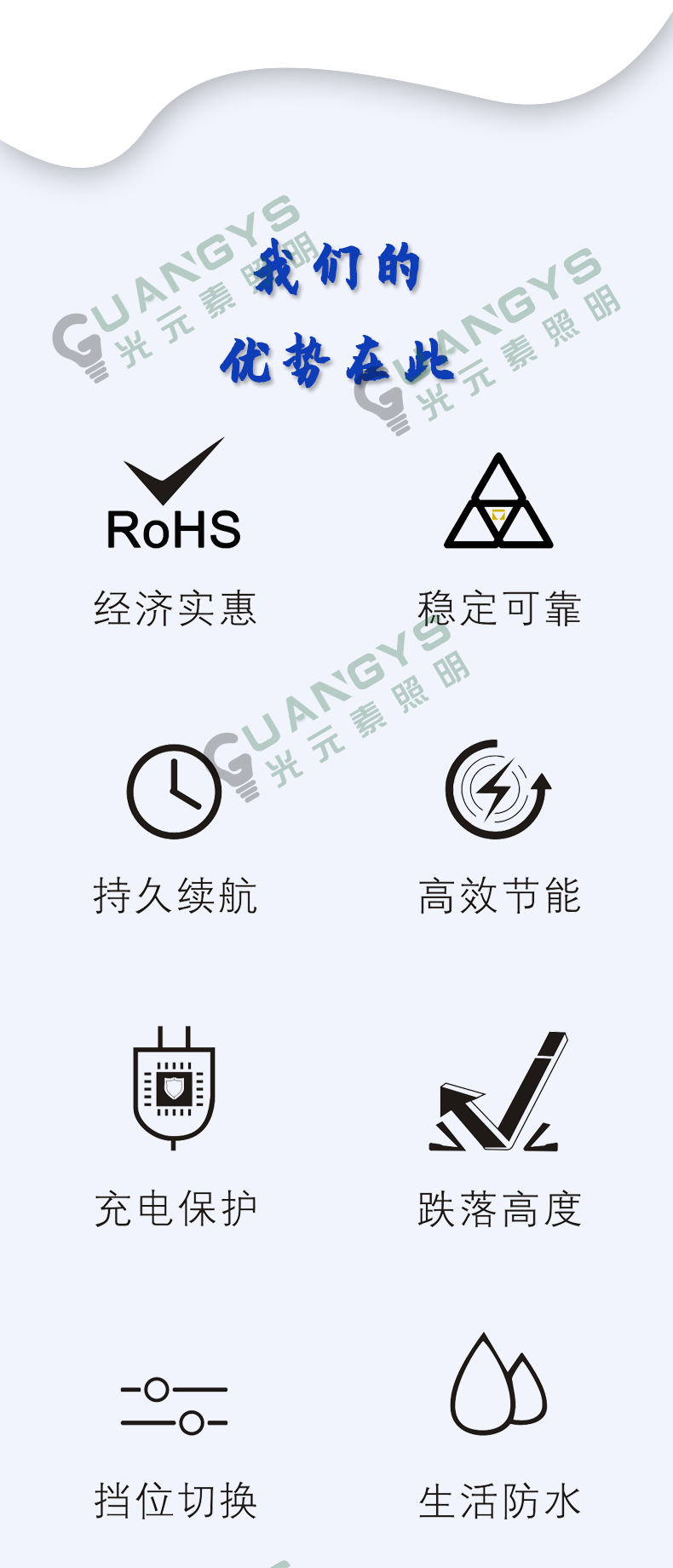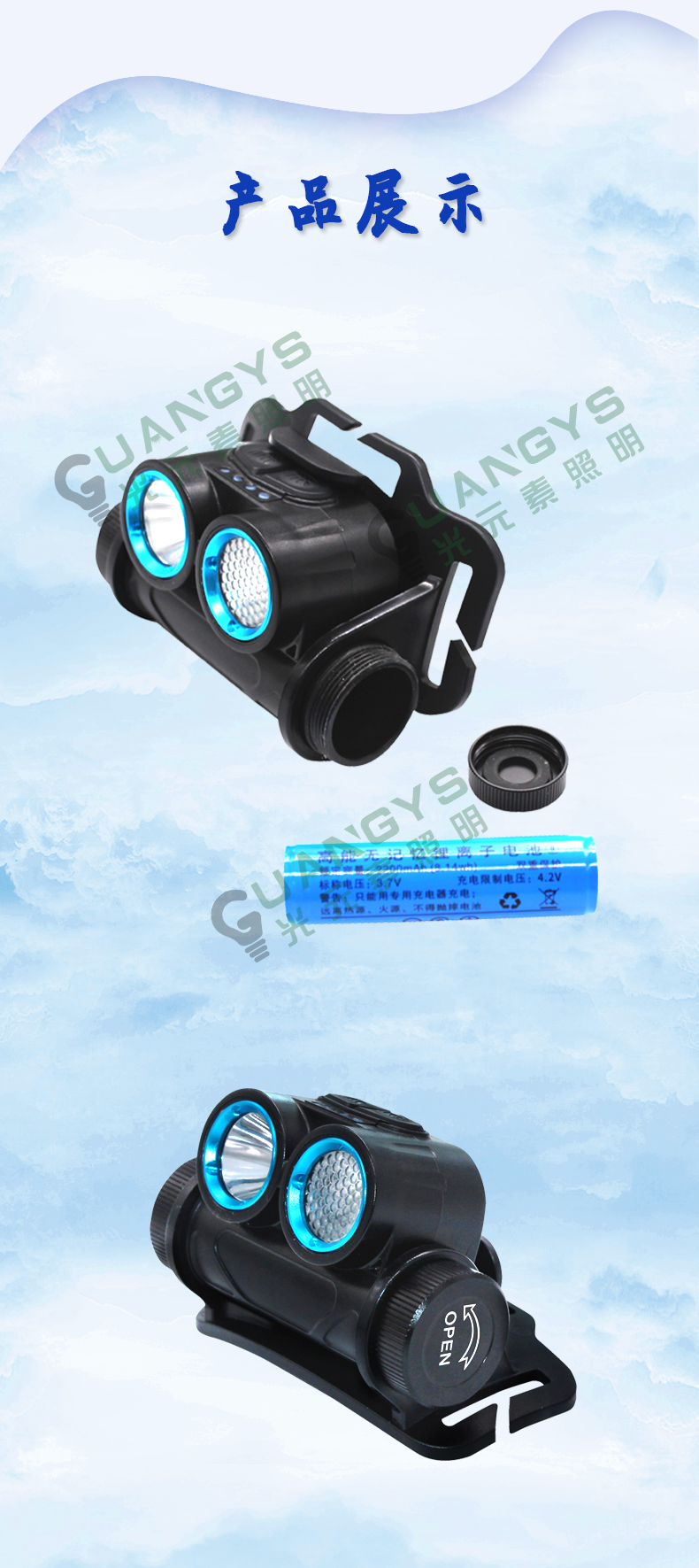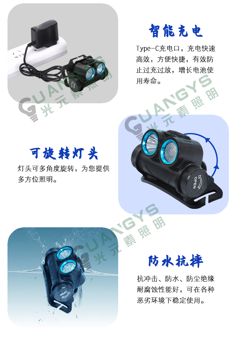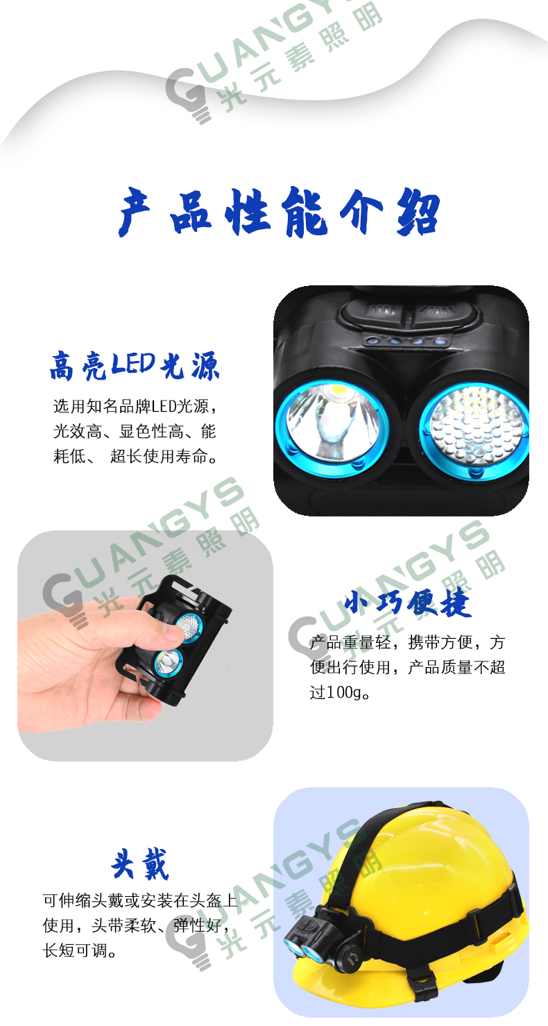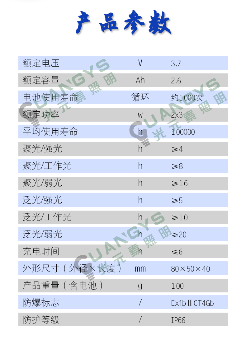 品牌名称:光元素照明 额定电压:3.7V 配用光源:LED 额定功率:6W 防爆标志:ExibⅡCT4Gb 防护等级:IP66 产品描述:广泛用网电、厂电、冶金、油田、公安、消防、铁路、部队等行业提供应急工作照明(1区、2区)