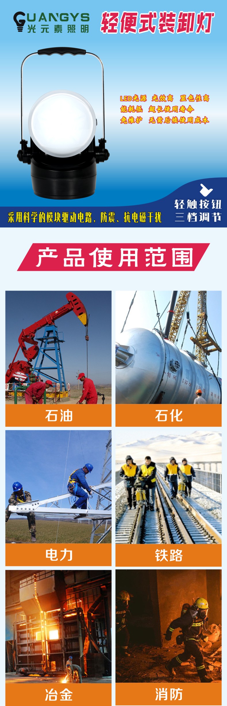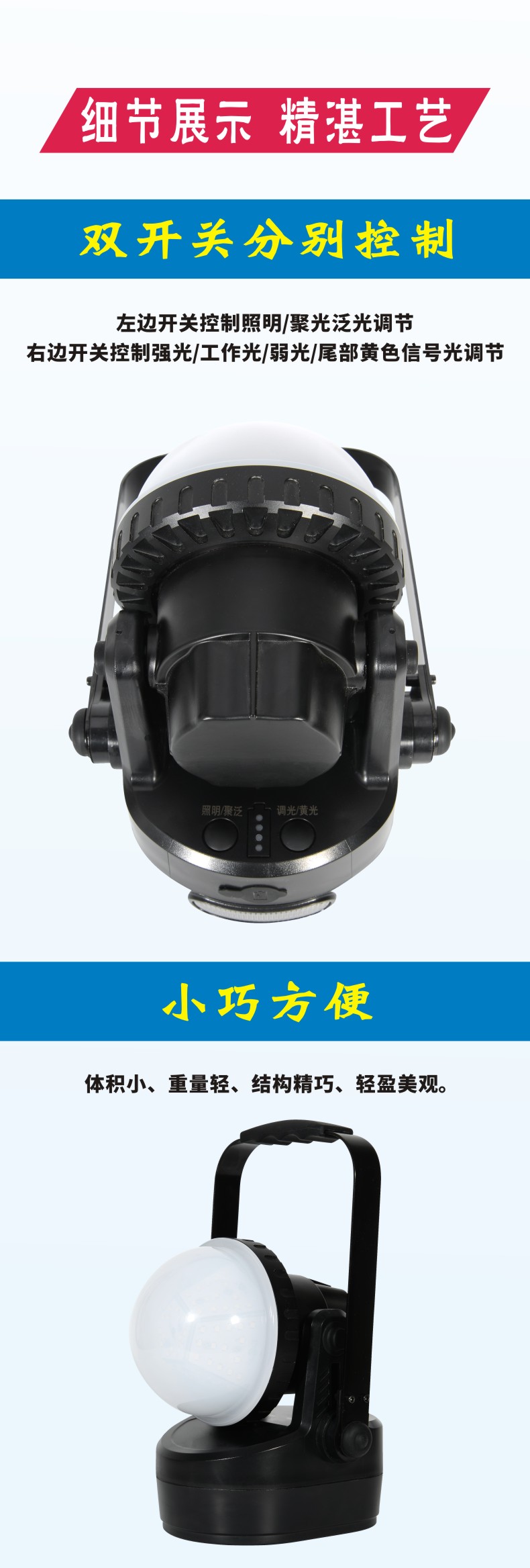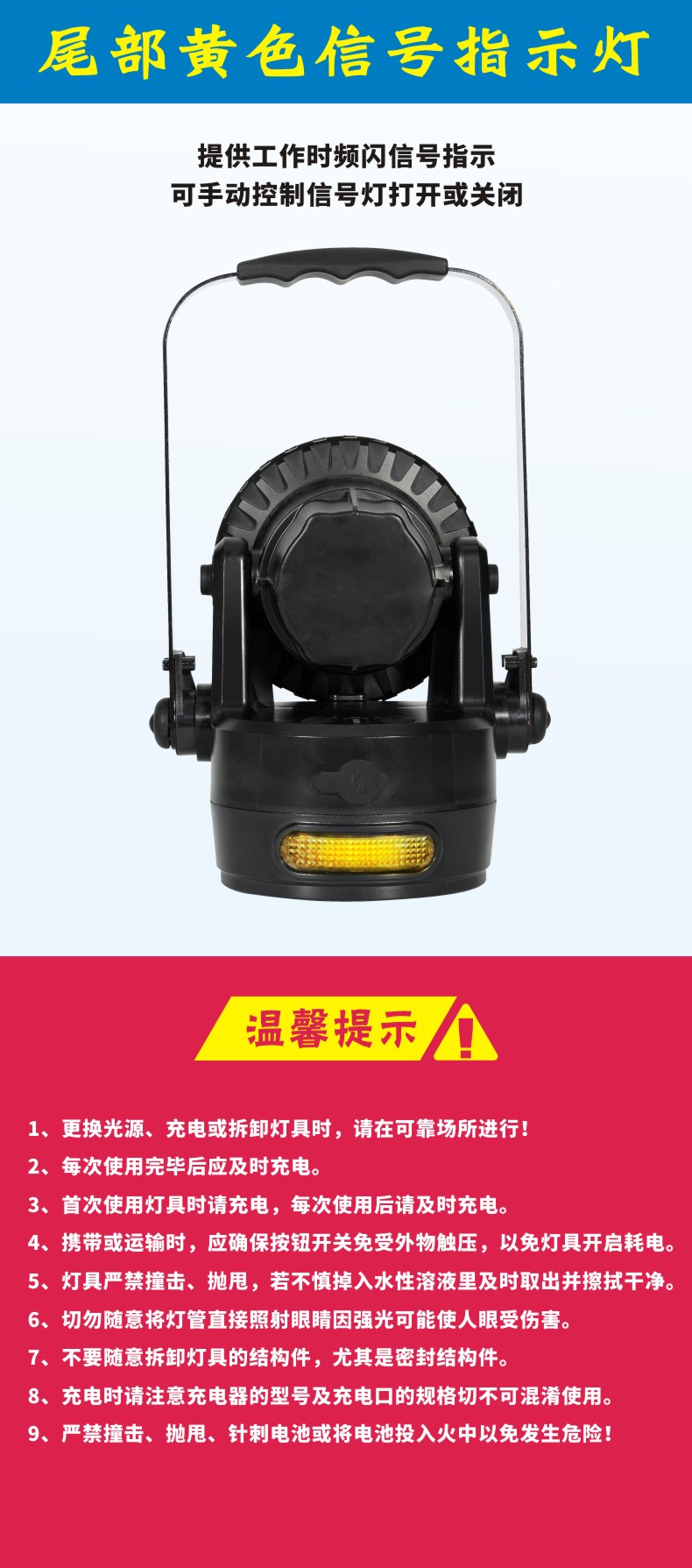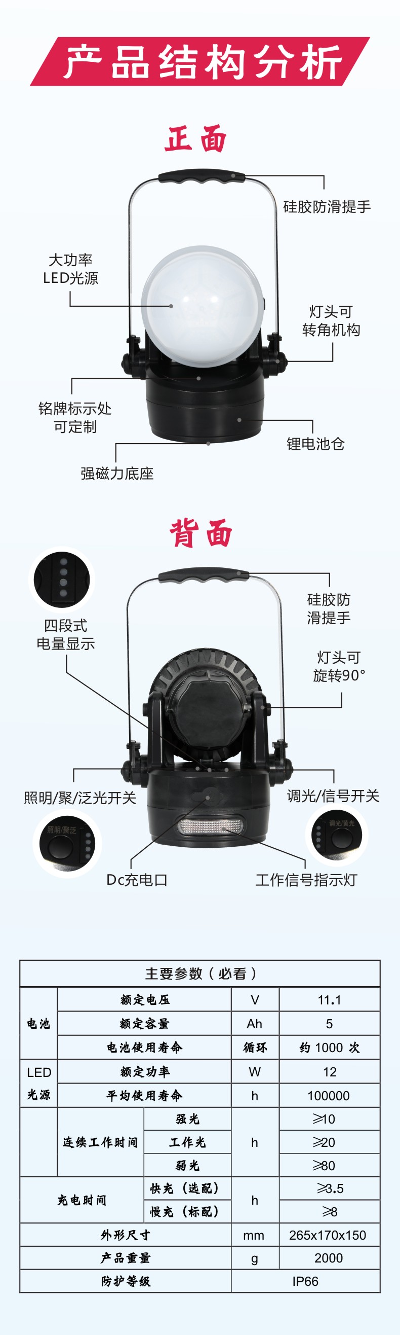 额定电压:11.1V 额定功率:12W 额定容量:5Ah 防护等级:IP66 产品尺寸:Φ260x170x150mm 产品重量:2000g 产品描述:灯具设有强光、工作光两种工作模式,采用智能芯片控制开关,强弱光可任意转换;智能型充电器设有过充、短路保护及充电提示装置,可延长灯具使用寿命;四段式电量显示,底部带黄色警示灯,可手提、座放、吊挂、磁力吸附等多种使用方式,适用于铁路、电业、公安、油田、冶金、石化、企业夜间野外作业、货场装卸、巡逻检修、事故抢修工作现场提供移动照明。