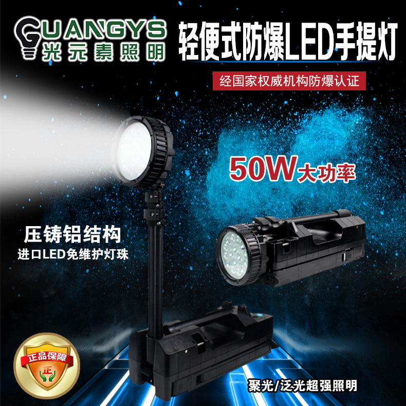 品牌名称:光元素照明 输入电压:22V 配用光源:LED 额定功率:50W 防护等级:IP66 产品描述:适用于炼油、化工、油田等易燃易爆场所小范围施工、检修、抢险应急照明。