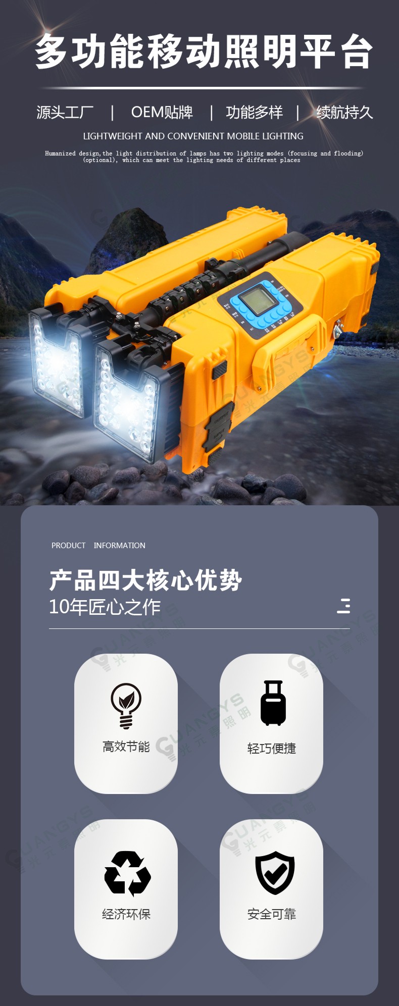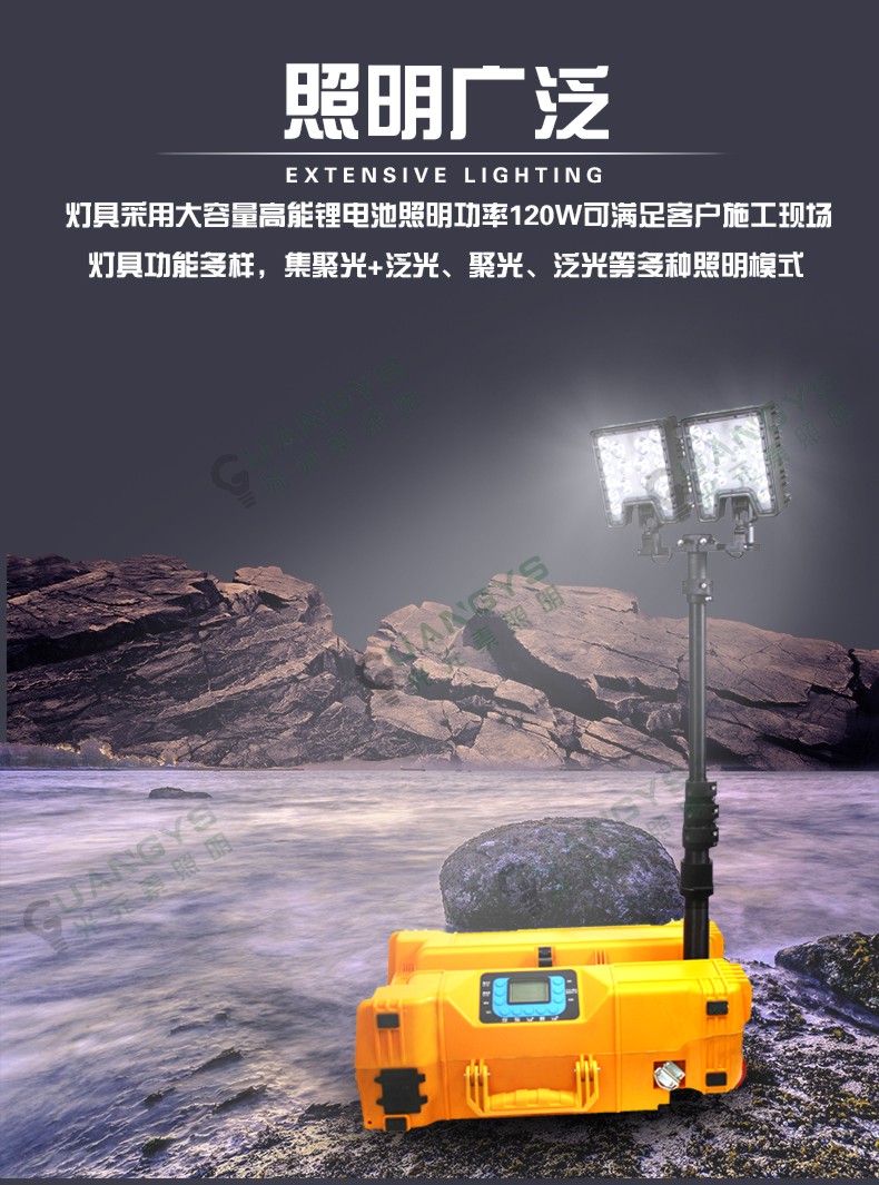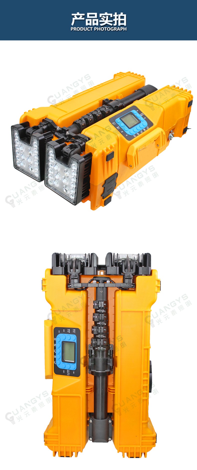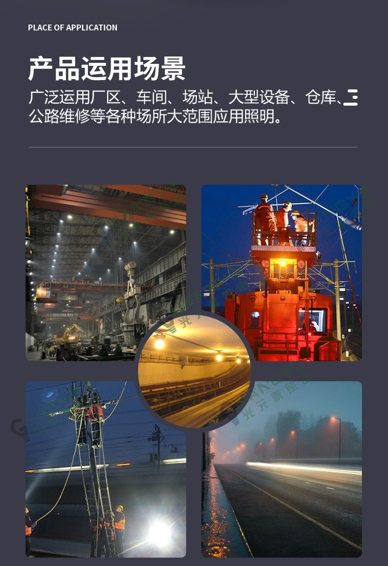 品牌名称:光元素照明 额定电压:21.6V 配用光源:LED 额定功率:120W 防护等级:IP66 产品描述:适用于铁路工务、电务、供电、运输等场所小范围检修、施工照明,同事也适用于电网、公消等行业小方位应急照明使用。