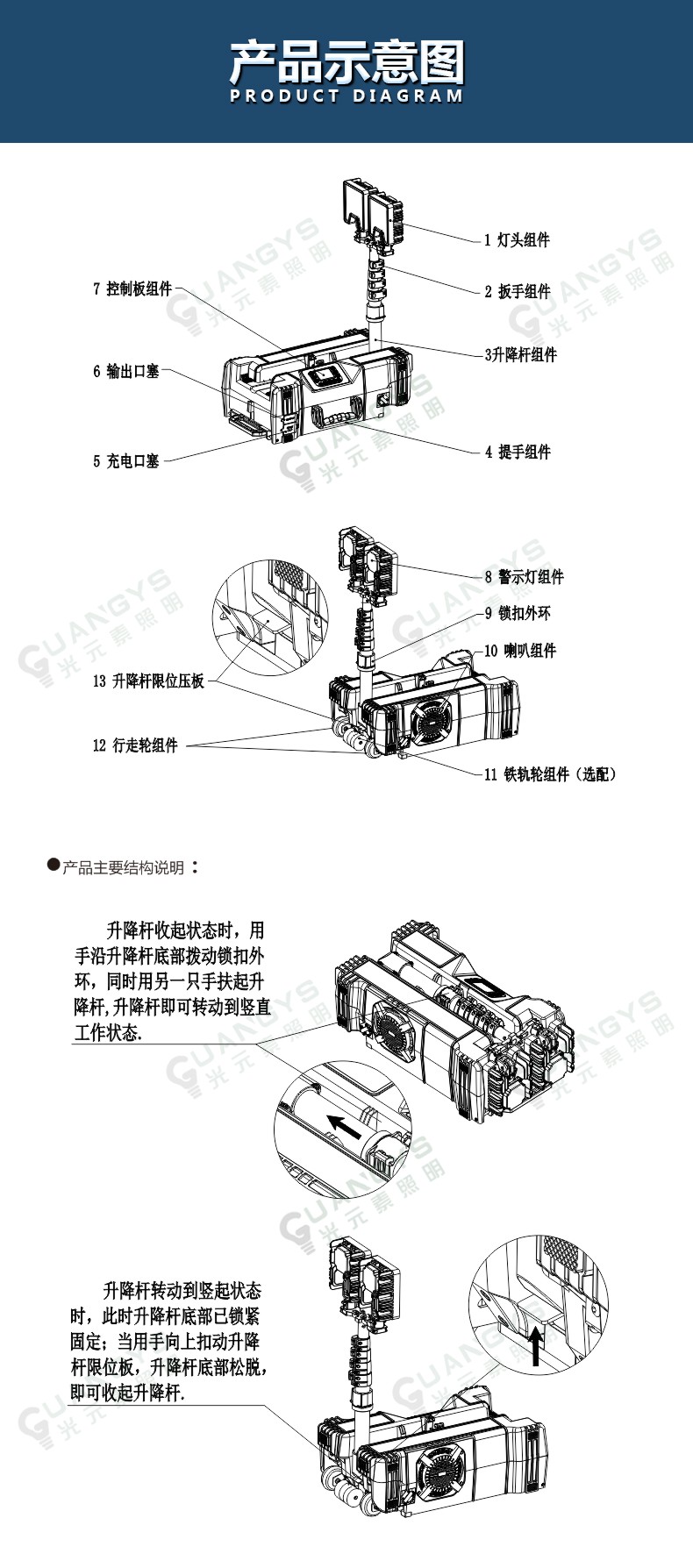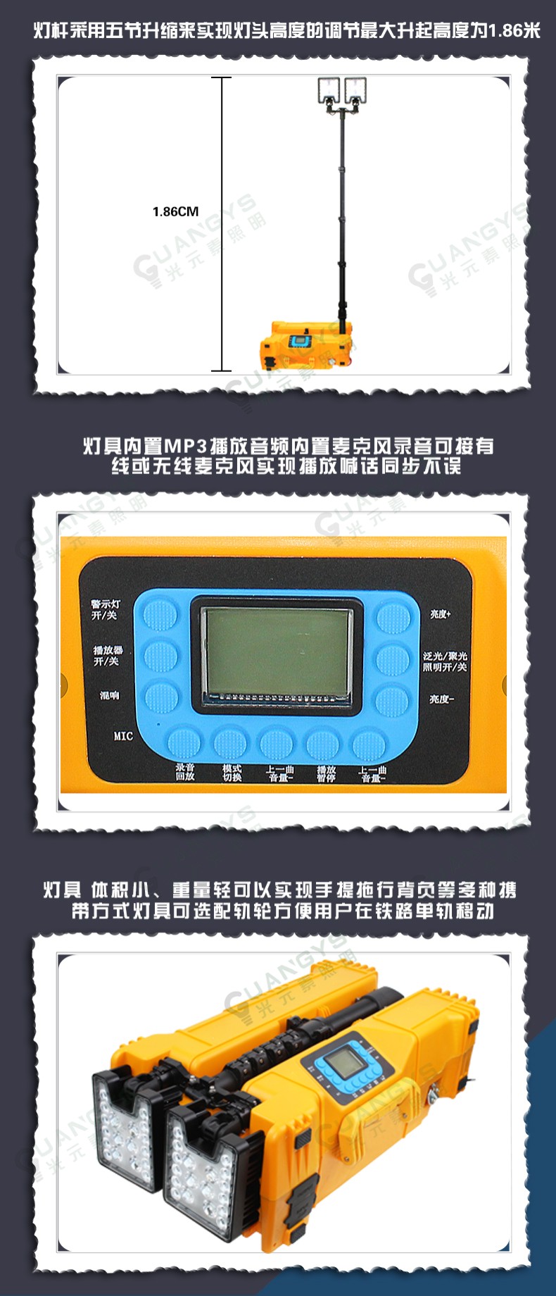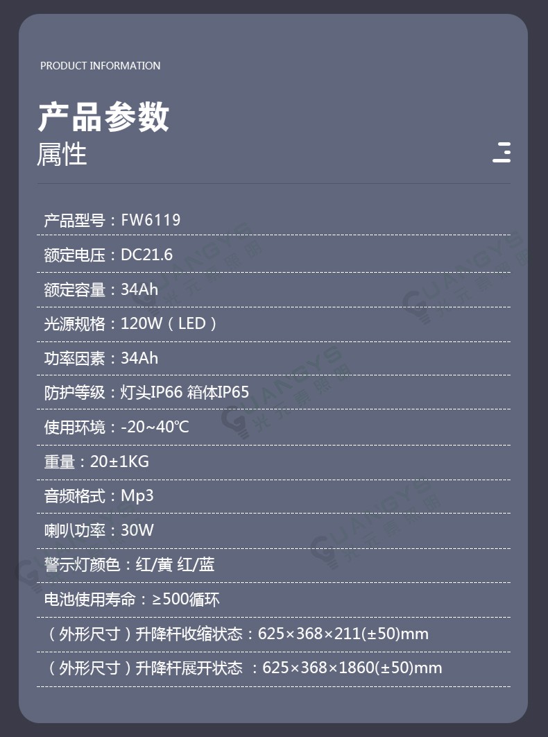 品牌名称:光元素照明 额定电压:21.6V 配用光源:LED 额定功率:120W 防护等级:IP66 产品描述:适用于铁路工务、电务、供电、运输等场所小范围检修、施工照明,同事也适用于电网、公消等行业小方位应急照明使用。